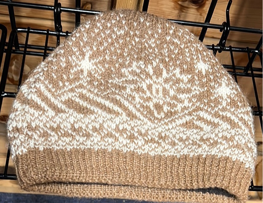 The hat features our new "Mountain Eve" knit pattern using naturally colored alpaca yarn to create the contrasting design.